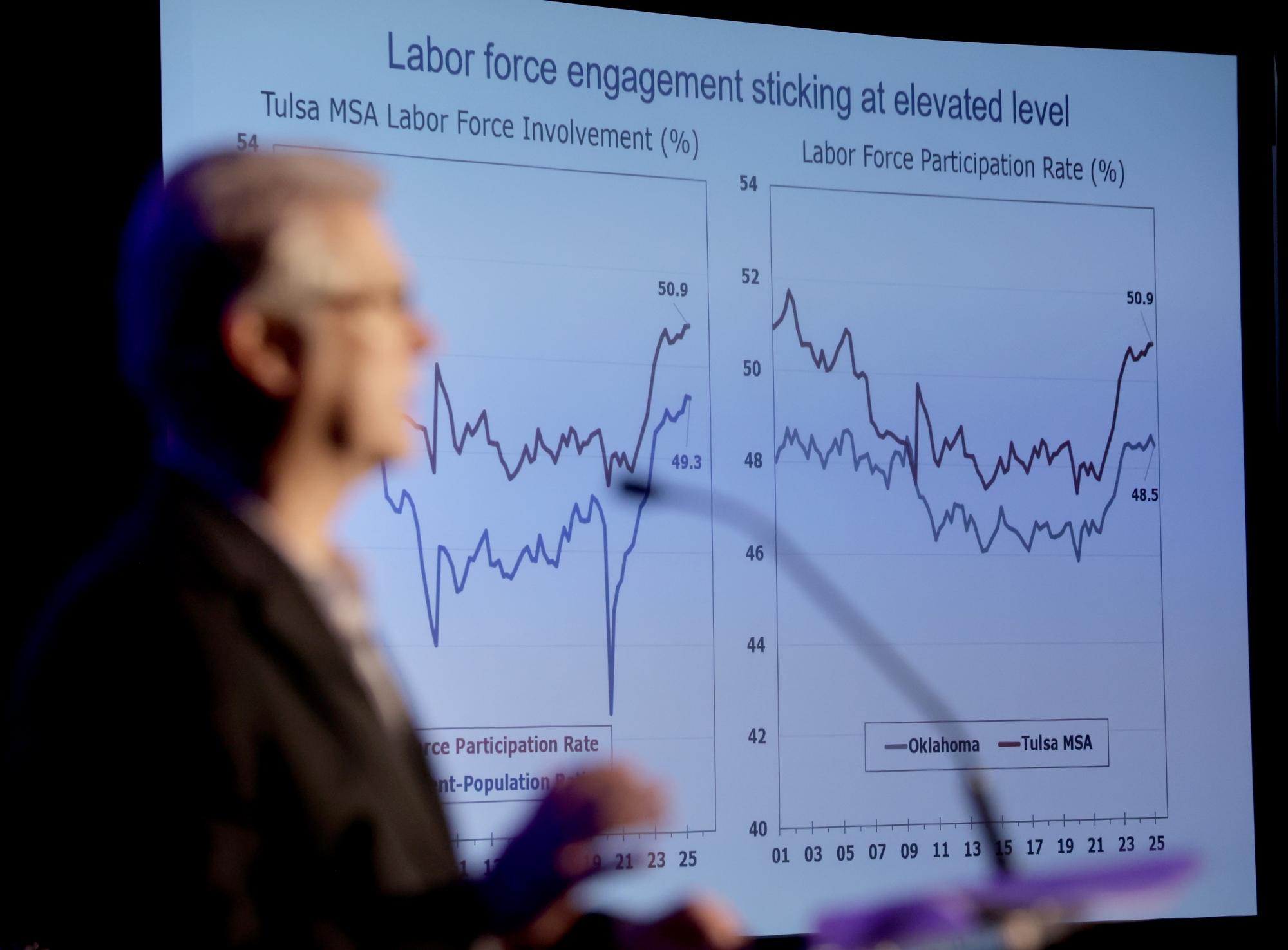 The audience also heard global and national economic breakdowns from JPMorgan Private Bank’s Joe Sedyl (senior markets economist), who was part of a moderated discussion with Eric Sullivan, and a state/local analysis from Mark Snead, Ph.D., an economist and president of RegionTrack.